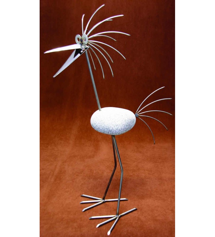 Edelstahl und Stein – die Kombination zweier Materialien, die in den unterschiedlichsten Zeitepochen entstanden sind – ist die Eigenart der Steinvögel.