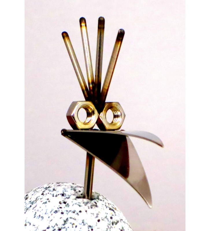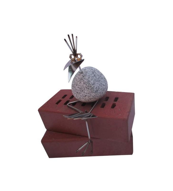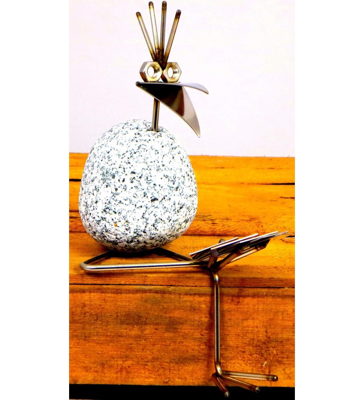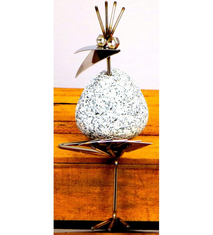 Der witzige Kantenhocker hat eine Gesamtgröße von ca. 22 cm. Als Körper dient ein getrommelter Granitzierkiesel. Der Hals der fest mit dem Kopf verbunden ist, die Beine und die 5 Pokerkarten sind aus Edelstahl gearbeitet. Der sitzende Steinvogel sitzt lässig da und schaut sich seine Pokerkarten genauer an. Seinen Kamm trägt er nach hinten. Sein Blick ist witzig und frech. Als Augen wurden 2 Sechskantschrauben verwendet.