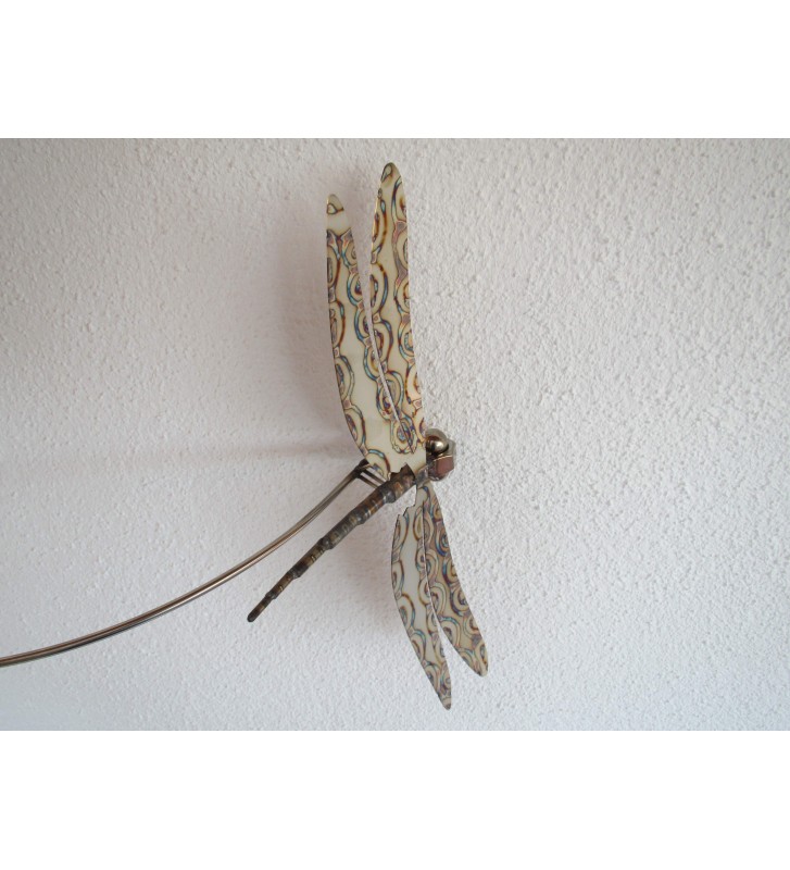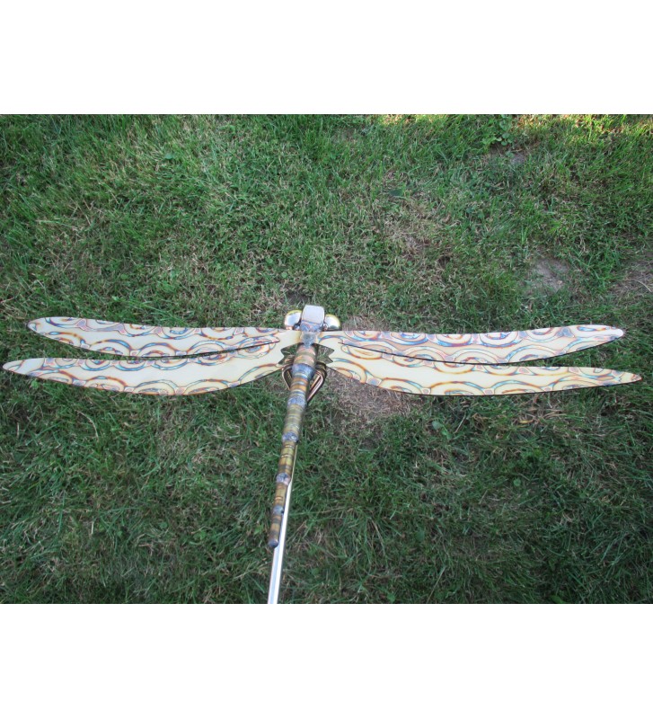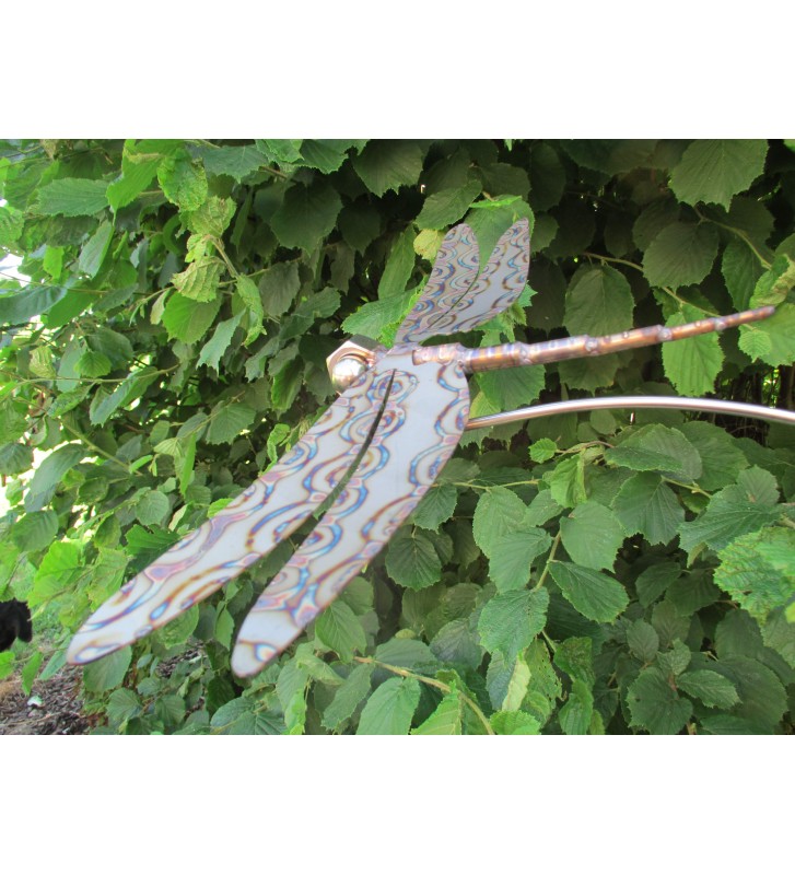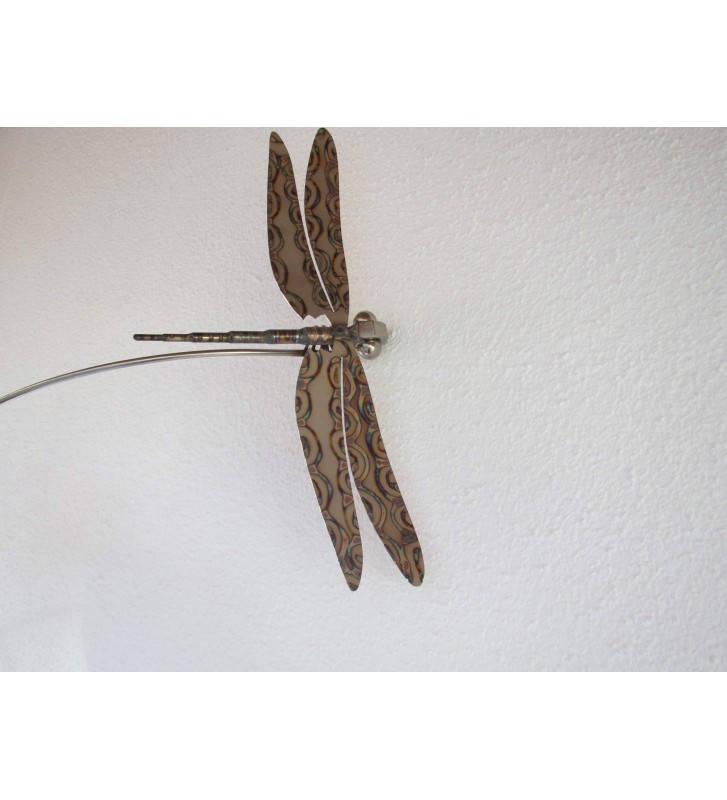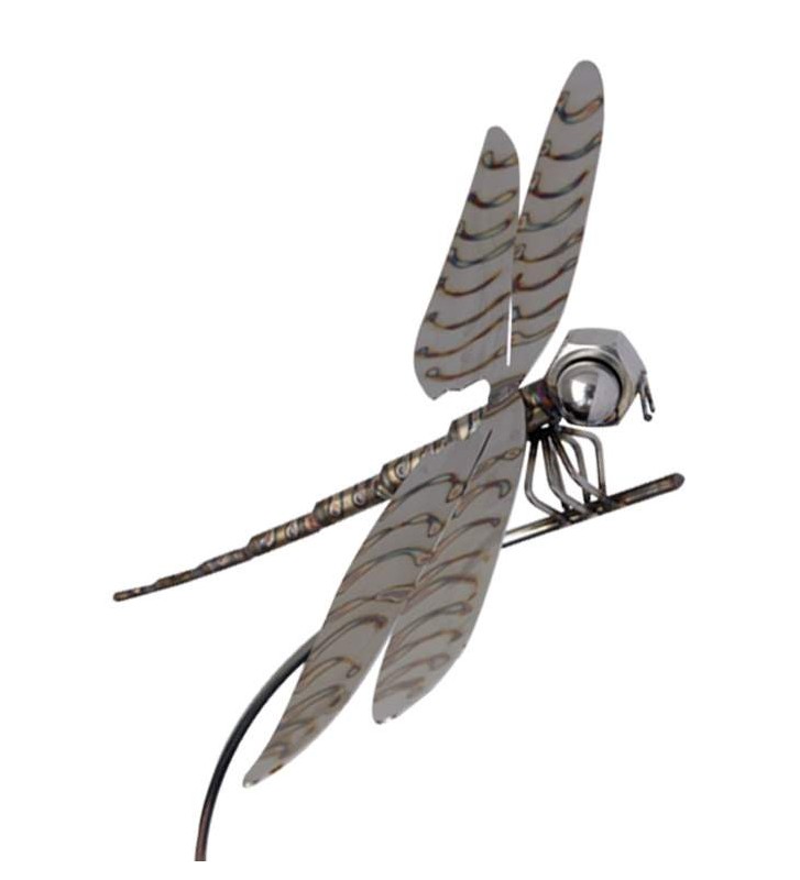 Gartenstecker Libelle aus Edelstahl mit liebevoller Verzierung und Branding am 200 cm langem Schwingstab zweiteilig
