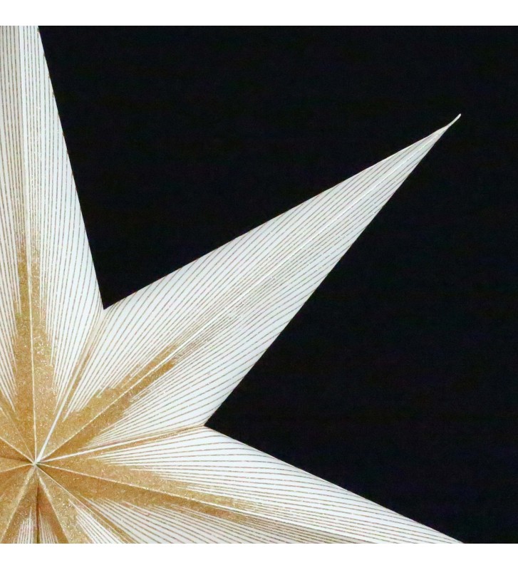 Der Leuchtstern Melchior wurde in einer sehr festlichen Farbgebung gestaltet. Das handgeschöpfte Papier ist weiß. Der Stern verfügt über viele feine Goldstreifen und ist zusätzlich noch goldgecrashed. Wunderbar anzusehen. Mit seinen 7 Zacken und seiner Größe lässt er sich zu Weihnachten wunderbar in ihrem zu Hause dekorieren. Ob hängend an einem Fenster oder auf unserem Standfüß für Leuchtsterne den sie hier zusätzlich erwerben können ist es leicht möglich ein stimmungsvolles Licht zu zaubern. Sie können entweder ein Stromkabel mit Fassung benutzen, wie es hier im Shop erhältlich ist, oder aber sie geben einfach eine handelsübliche Lichterkette die batteriebetrieben ist in die Mitte des Sternes. Dann sind sie unabhängig von einer Steckdose.
