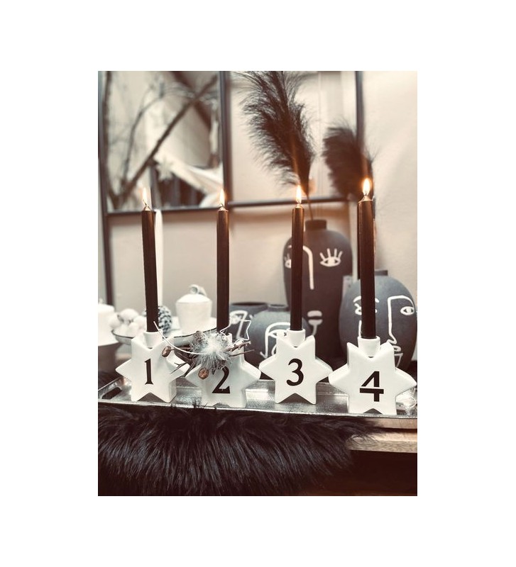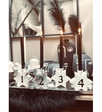 XMAS Kerzenhalter 4-er SET Chrissie, weiß, Keramik, ca. 13,7x4x13,7 cm, geeignet für 22 mm Stabkerzen-Ø. Hochwertige Kerzenhalter im 4-er Set mit den Zahlen 1 bis 4 für die festliche Weihnachtszeit. Hochwertige Verarbeitung und besonders dekorativ für die Adventszeit mit weißen, schwarzen oder goldenen Stabkerzen.